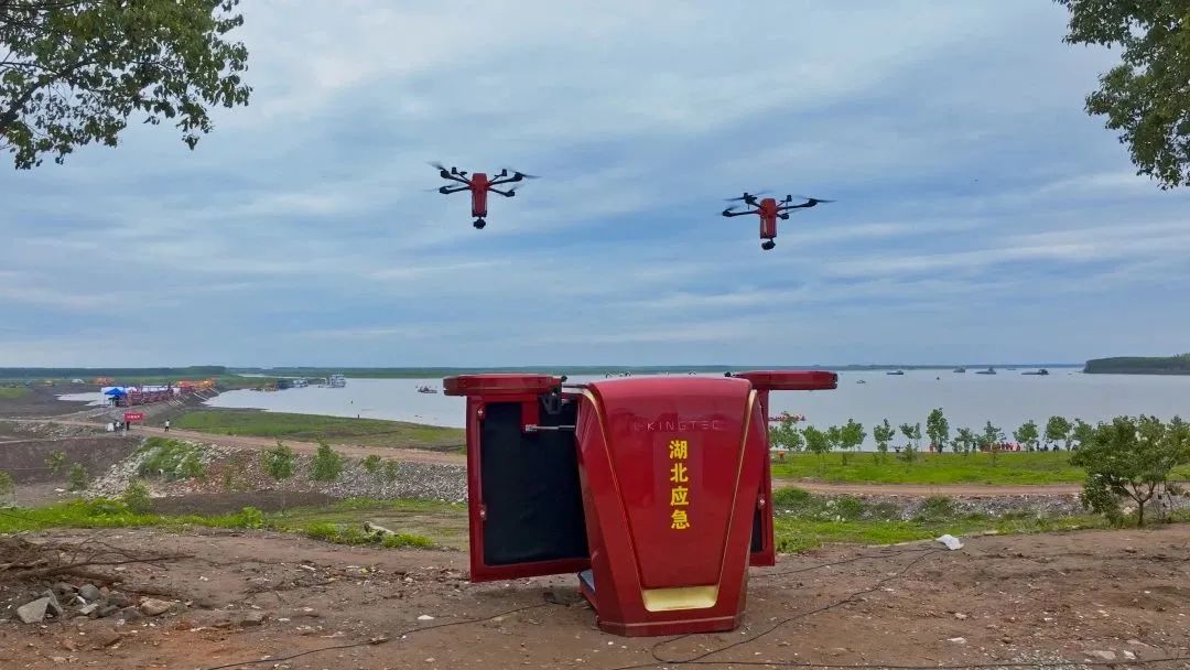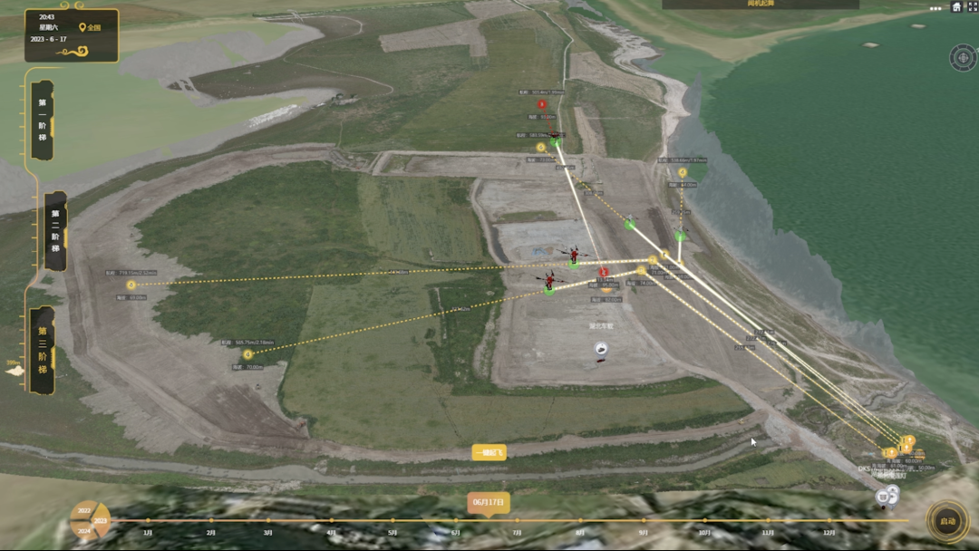 在指挥部领导的协调统领下,云圣智能共计投入2套圣·宝莲灯全自主巡检系统、1套圣Max·战袍全自主巡检系统和1套虎鲸·虎穴车载移动式全自主巡检系统,组成防汛应急临时编队。在演练中,指挥部通过湖北省应急指挥平台对无人机编队进行航线规划并下达侦测指令。5架无人机分别从各自机场依次起飞、执行预设任务,并在所有侦测任务完成后返回机场、自动更换电池和吊舱;同时自主生成三维地图,及时回传侦测信息至指挥平台。