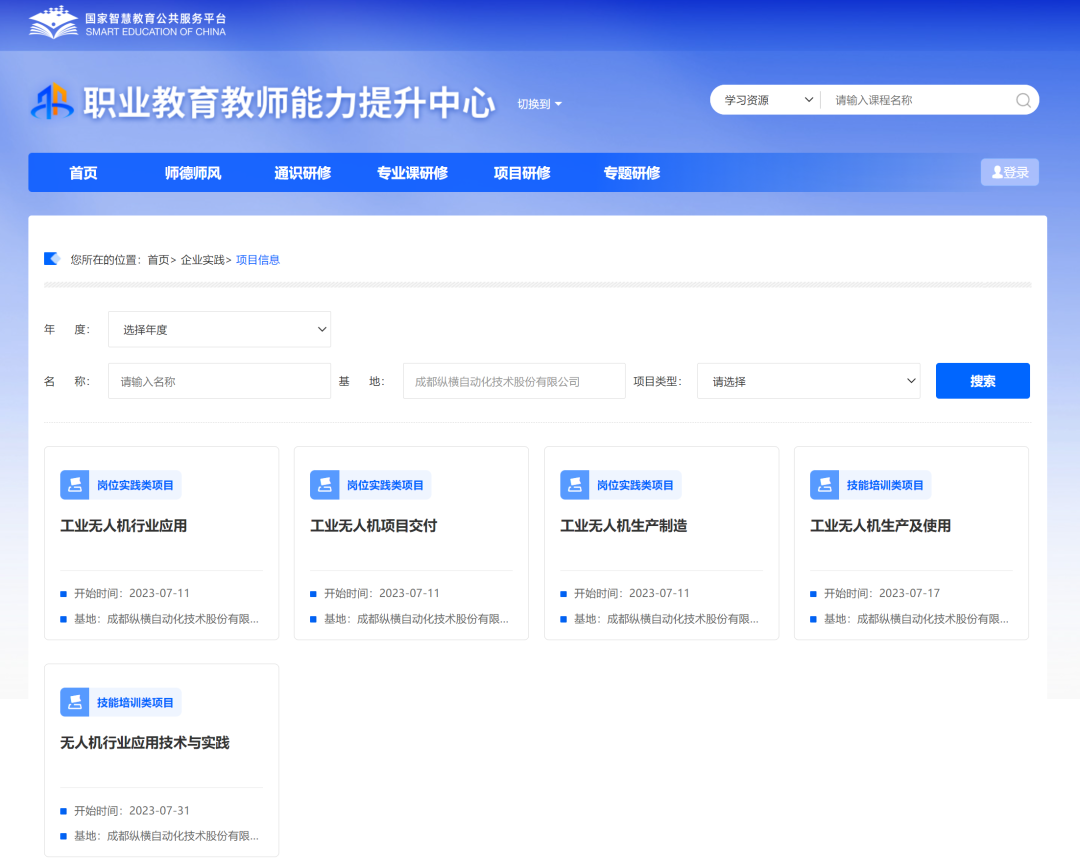 更多详细信息,参见国家职业教育智慧教育平台“教师能力提升中心”(https://teacher.vocational.smartedu.cn/h/home/qysj/),搜索基地“成都纵横自动化技术股份有限公司”,即可查看所有项目。