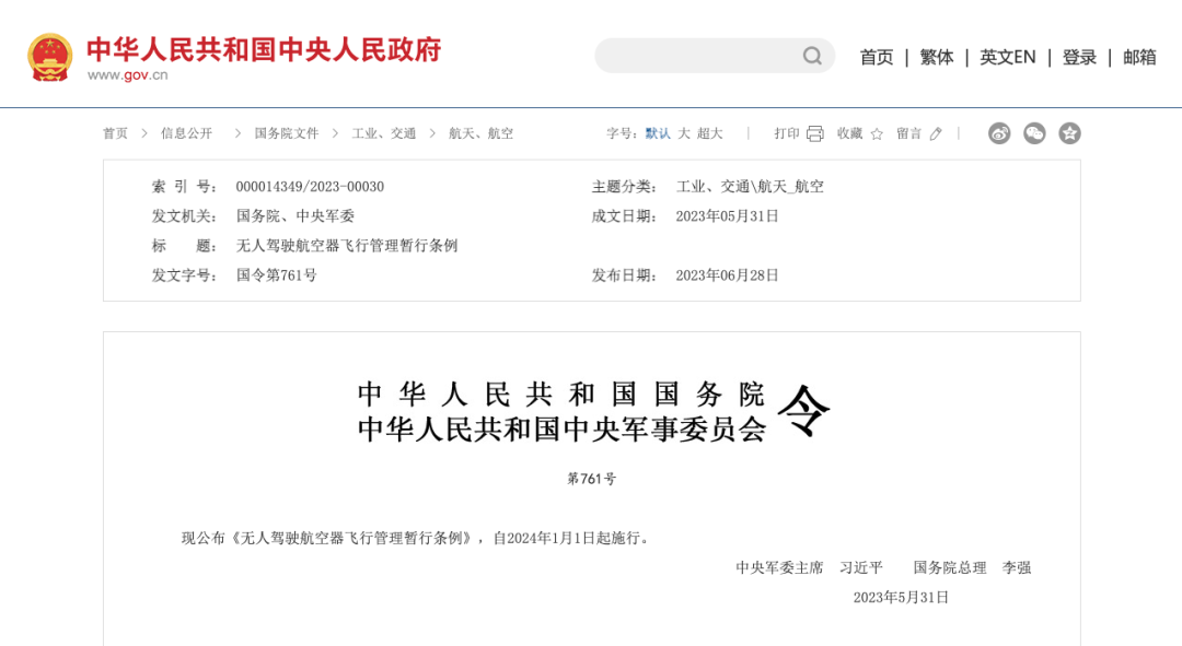 国务院、中央军委日前公布《无人驾驶航空器飞行管理暂行条例》(以下简称《条例》),自2024年1月1日起施行。《条例》贯彻总体国家安全观,统筹发展和安全,坚持底线思维和系统观念,以维护航空安全、公共安全、国家安全为核心,以完善无人驾驶航空器监管规则为重点,对无人驾驶航空器从设计生产到运行使用进行全链条管理,着力构建科学、规范、高效的无人驾驶航空器飞行及相关活动管理制度体系,为防范化解无人驾驶航空器安全风险、助推相关产业持续健康发展提供有力法治保障。《条例》共6章63条。主要按照分类管理思路,加强对无人驾驶航空器设计、生产、维修、组装等的适航管理和质量管控,建立产品识别码和所有者实名登记制度,明确使用单位和操控人员资质要求;严格飞行活动管理,划设无人驾驶航空器飞行管制空域和适飞空域,建立飞行活动申请制度,明确飞行活动规范;强化监督管理和应急处置,健全一体化综合监管服务平台,落实应急处置责任,完善应急处置措施。第一条 为了规范无人驾驶航空器飞行以及有关活动,促进无人驾驶航空器产业健康有序发展,维护航空安全、公共安全、国家安全,制定本条例。第二条 在中华人民共和国境内从事无人驾驶航空器飞行以及有关活动,应当遵守本条例。本条例所称无人驾驶航空器,是指没有机载驾驶员、自备动力系统的航空器。无人驾驶航空器按照性能指标分为微型、轻型、小型、中型和大型。第三条 无人驾驶航空器飞行管理工作应当坚持和加强党的领导,坚持总体国家安全观,坚持安全第一、服务发展、分类管理、协同监管的原则。第四条 国家空中交通管理领导机构统一领导全国无人驾驶航空器飞行管理工作,组织协调解决无人驾驶航空器管理工作中的重大问题。国务院民用航空、公安、工业和信息化、市场监督管理等部门按照职责分工负责全国无人驾驶航空器有关管理工作。县级以上地方人民政府及其有关部门按照职责分工负责本行政区域内无人驾驶航空器有关管理工作。各级空中交通管理机构按照职责分工负责本责任区内无人驾驶航空器飞行管理工作。第五条 国家鼓励无人驾驶航空器科研创新及其成果的推广应用,促进无人驾驶航空器与大数据、人工智能等新技术融合创新。县级以上人民政府及其有关部门应当为无人驾驶航空器科研创新及其成果的推广应用提供支持。国家在确保安全的前提下积极创新空域供给和使用机制,完善无人驾驶航空器飞行配套基础设施和服务体系。第六条 无人驾驶航空器有关行业协会应当通过制定、实施团体标准等方式加强行业自律,宣传无人驾驶航空器管理法律法规及有关知识,增强有关单位和人员依法开展无人驾驶航空器飞行以及有关活动的意识。第七条 国务院标准化行政主管部门和国务院其他有关部门按照职责分工组织制定民用无人驾驶航空器系统的设计、生产和使用的国家标准、行业标准。第八条 从事中型、大型民用无人驾驶航空器系统的设计、生产、进口、飞行和维修活动,应当依法向国务院民用航空主管部门申请取得适航许可。从事微型、轻型、小型民用无人驾驶航空器系统的设计、生产、进口、飞行、维修以及组装、拼装活动,无需取得适航许可,但相关产品应当符合产品质量法律法规的有关规定以及有关强制性国家标准。从事民用无人驾驶航空器系统的设计、生产、使用活动,应当符合国家有关实名登记激活、飞行区域限制、应急处置、网络信息安全等规定,并采取有效措施减少大气污染物和噪声排放。第九条 民用无人驾驶航空器系统生产者应当按照国务院工业和信息化主管部门的规定为其生产的无人驾驶航空器设置唯一产品识别码。微型、轻型、小型民用无人驾驶航空器系统的生产者应当在无人驾驶航空器机体标注产品类型以及唯一产品识别码等信息,在产品外包装显著位置标明守法运行要求和风险警示。第十条 民用无人驾驶航空器所有者应当依法进行实名登记,具体办法由国务院民用航空主管部门会同有关部门制定。涉及境外飞行的民用无人驾驶航空器,应当依法进行国籍登记。第十一条 使用除微型以外的民用无人驾驶航空器从事飞行活动的单位应当具备下列条件,并向国务院民用航空主管部门或者地区民用航空管理机构(以下统称民用航空管理部门)申请取得民用无人驾驶航空器运营合格证(以下简称运营合格证):(一)有实施安全运营所需的管理机构、管理人员和符合本条例规定的操控人员;(二)有符合安全运营要求的无人驾驶航空器及有关设施、设备;(三)有实施安全运营所需的管理制度和操作规程,保证持续具备按照制度和规程实施安全运营的能力;民用航空管理部门收到申请后,应当进行运营安全评估,根据评估结果依法作出许可或者不予许可的决定。予以许可的,颁发运营合格证;不予许可的,书面通知申请人并说明理由。使用最大起飞重量不超过150千克的农用无人驾驶航空器在农林牧渔区域上方的适飞空域内从事农林牧渔作业飞行活动(以下称常规农用无人驾驶航空器作业飞行活动),无需取得运营合格证。取得运营合格证后从事经营性通用航空飞行活动,以及从事常规农用无人驾驶航空器作业飞行活动,无需取得通用航空经营许可证和运行合格证。第十二条 使用民用无人驾驶航空器从