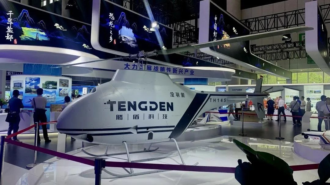 位列“五区共兴”自贡馆的是没羽箭无人直升机,这是一款由腾盾自主研发的高原型、多用途中型无人直升机。该机于2019年12月17日完成首飞,已多次完成高原试飞、定点灭火等试验任务,不断挑战高原、海洋等复杂气候环境,不断刷新高度、速度等飞行性能记录,充分验证其具有优异的高原和海洋部署能力,良好的自主飞行和任务保障效率。
