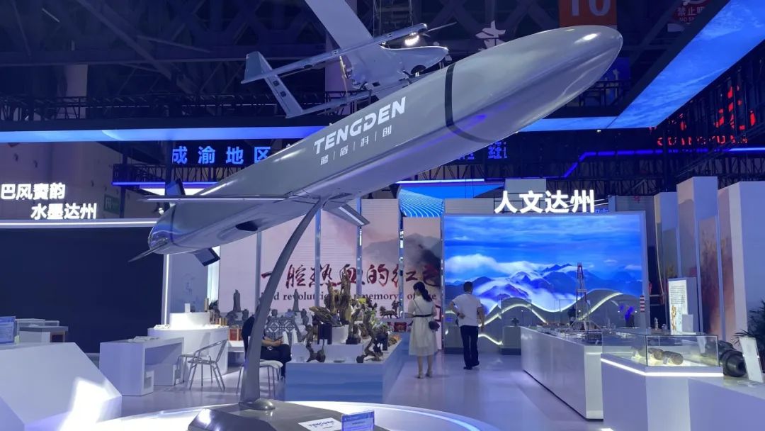 “五区共兴”达州馆展出的是由腾盾自主研发的TS20小型涡喷无人机,该款小型无人机是继第十四届中国航展公开亮相后首次在川内展出,该机可地面放飞或空中投放,续航时间长、任务半径大、抗干扰能力强,可执行航空防务、广域巡查等任务。