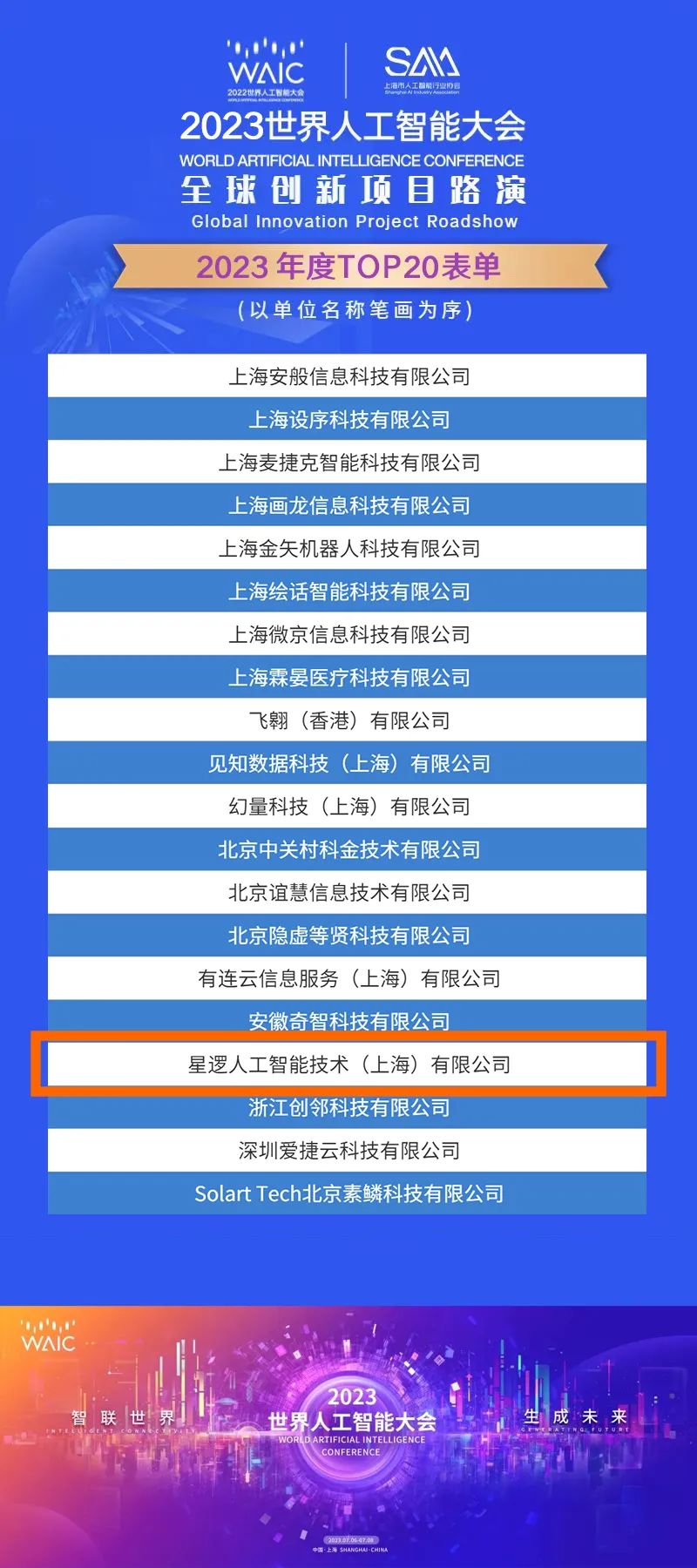 近日,2023 WAIC全球创新项目路演TOP 20榜单发布,星逻智能成功入围。2023 WAIC全球创新项目路演自启动以来便受到了行业内外广泛的关注,在初评入围的50家项目中,经过4天的线上复评,甄选出20家优秀企业项目入围终评。