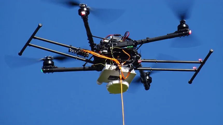 ●无人机携带建立移动网络覆盖所需的设备从地面起飞