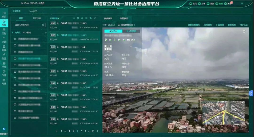 低空无人机遥感网基层治理模式以“无人机+智能基站+遥感平台”的一体化运营为基础,将城市管理的各个部门资源高效整合,深入社会治理的不同场景,实现了一张“网”管理和治理城市,并带动社会治理的各个环节进行数字化升级。