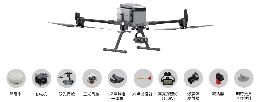 TA-Q20可以搭载三光吊舱、探照喊话一体机、抛投器、降落伞、发电机等任务载荷,真正实现一机多用,提供高效的使用体验。TA-Q20 也是行业内首款支持可同时挂载4种载荷设备的飞行平台,突破传统,展现卓越的技术实力。