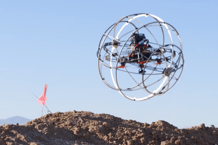亚利桑那州的Revolute Robotics展示了其自主混合移动机器人(HMR),这是一种旋转的球形笼子,可以像多旋翼飞行器一样飞行,也可以使用两个陀螺仪万向环向任何方向滚动。这是一件在运动中看到的事情。