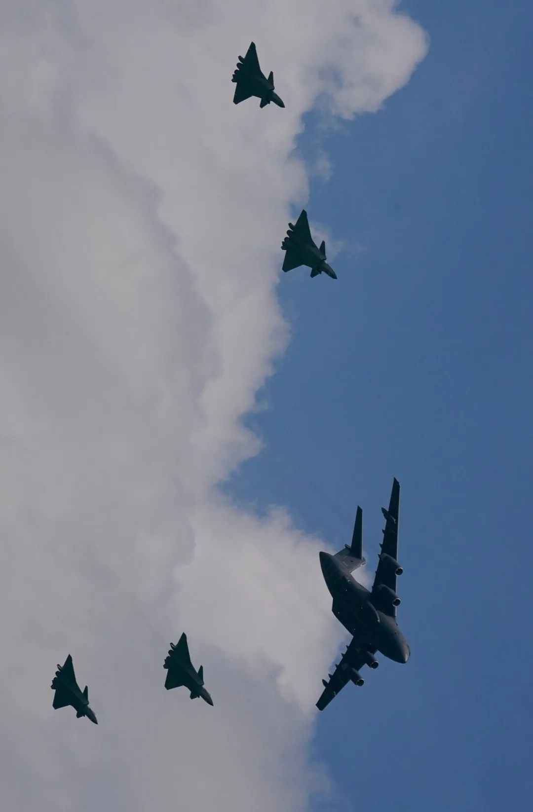 运油20与歼20四机护航编队低空通场