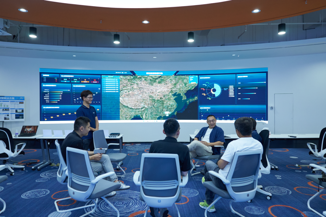 高巨创新低空监管团队向来访领导详细汇报了公司自主研发的低空无人机远程识别监管系统,并演示了系统对无人机在集群表演飞行任务和测试飞场飞行测试场景下的监管应用。