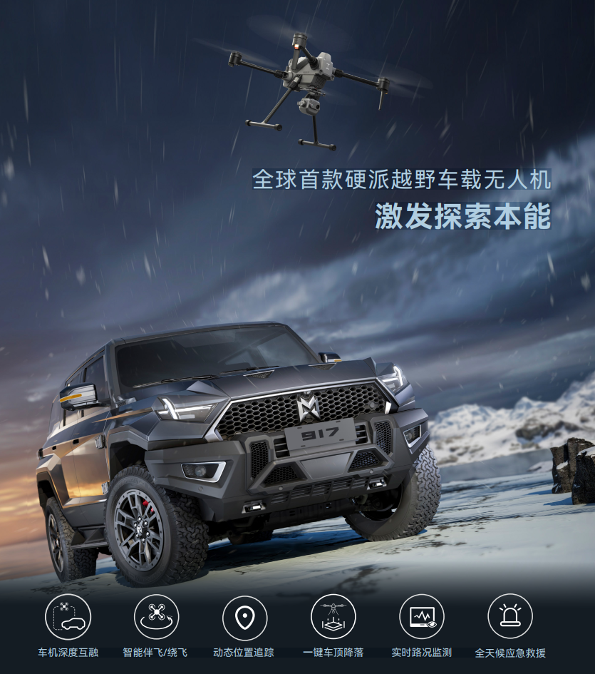 图丨猛士科技全球合作伙伴大会在汉举行猛士科技是东风公司打造的豪华电动越野品牌,其首款量产车型猛士917于今年4月在上海车展全球首发,可选配S400无人机。普宙科技车载无人机不仅仅是简单的“车+无人机”进行叠加,而是通过车机深度融合和随车智能伴飞 / 绕飞、动态位置追踪、实时路况监测、户外应急救援等强大功能,给户外运动人群带来更智能化、安全化的飞行体验,不断提升探寻的乐趣。