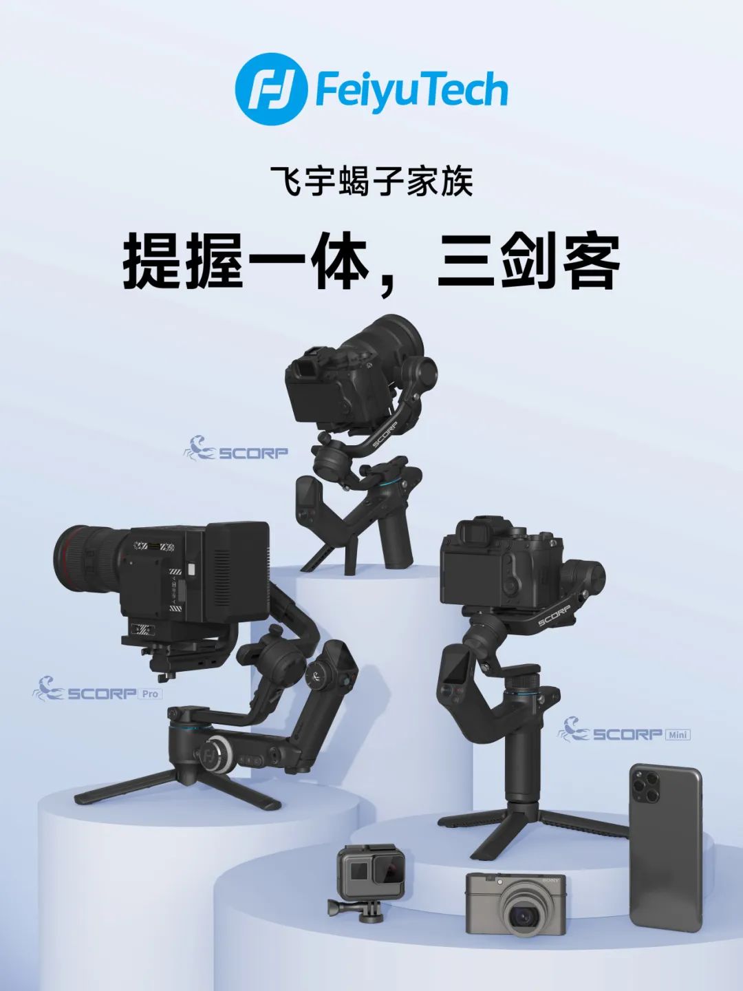 作为飞宇专业相机稳定器的代表产品,蝎子系列稳定器独特的手柄设计,让你握得更久,拍得更稳。