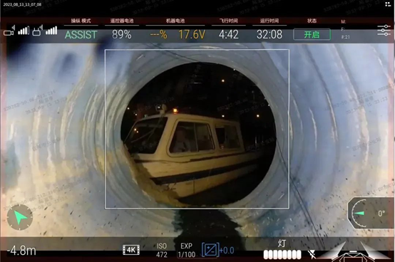 荆溪警务工作站民警2分钟到达现场,并第一时间将情况汇报情指中心。情指中心立即调度周边警力,通知十里牌派出所、宜城水上所、交警中队、消防救援大队、120急救中心进行增援。新天地广场屯兵点也闻警而动,4名“铁鹰”巡控队员也到场增援。经水上搜救,并根据现场情况综合分析,民警判断当事人已爬进一号桥附近河道内的污水管道。因管道内有大量沼气,救援人员无法直接进入施救,便紧急向巡特警精英小队请求增援!收到指令后,巡特警大队精英小队立即携带防碰撞无人机、单警防毒面罩、水下救援机器人、生命探测仪等针对水域救援的实战装备,火速到达现场。随后,巡特警精英小队凭借无人机实战应用的丰富经验和积累的技战法,多警种飞手、多机型无人机到场参与处置。由防碰撞无人机借助外部球形保护结构,深入救援人员难以进入的地下管网,实时传输视频数据,突破性拓展搜救视野距离。与此同时,长续航无人机搭载喊话器空中喊话,全覆盖搜寻河道水面。岸边的“铁鹰”队员也熟练操作便携型车载无人机,对周边管网出口开展空巡补充。多警种配合,多类型无人机集群组网体系作战,民警很快成功地找到了失联人员。