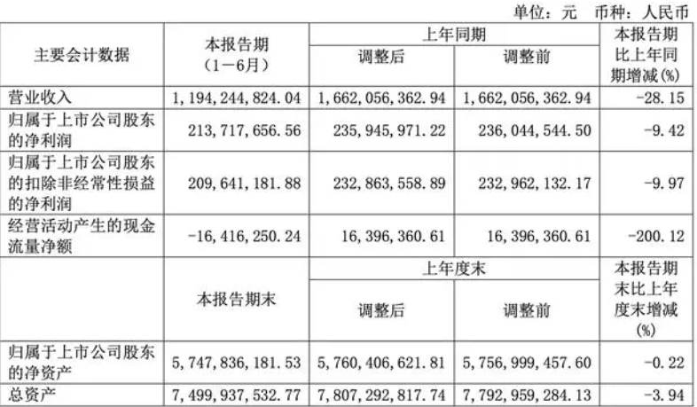该公司解释称,上半年营收下降是因按照合同约定,上半年交付产品数量较上年同期减少。而现金流量净额大幅度下降200.12%,主要受本期销售回款较上年同期有所下降影响。属于上市公司股东的净资产略下降0.22%,主要是公司于2023年6月完成利润分配2.376亿元,导致归属上市公司股东的净资产有所减少。