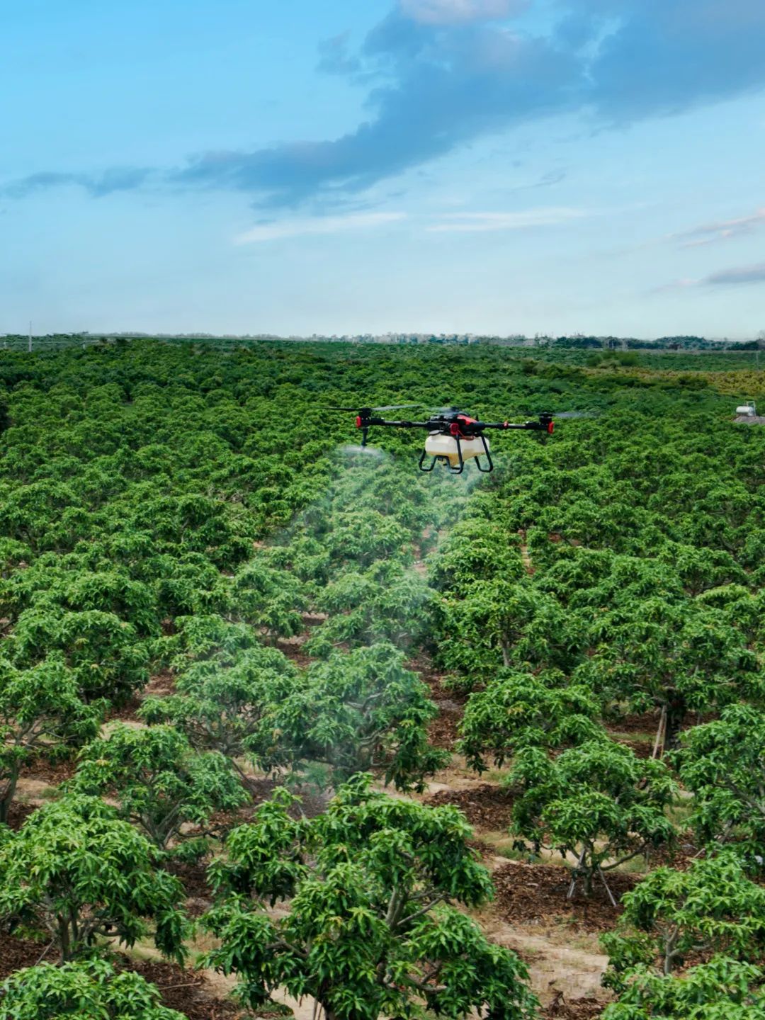 离心雾化喷洒,效果更精准、均匀,不仅能节省 30%-40% 农药使用,而且还能减少药斑的发生,芒果品相更好。在长芽、催花、保花、保果、防虫、杀菌各个环节都能使用,经济、高效、节省人工。一台P100 Pro 作业效率可顶十几个工人,能有效解决芒果植保旺季找人难、找人贵的问题。