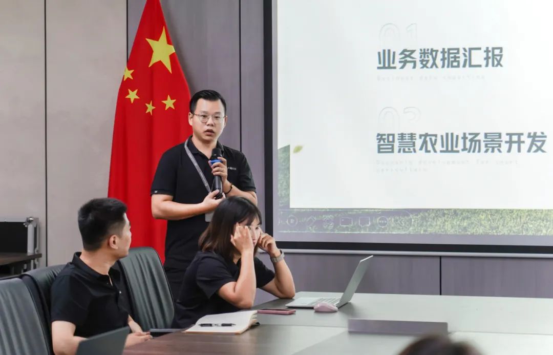 农机销售部负责人赵弘伟针对业务数据、智慧农业场景开发、渠道管理动作、下半年目标四维度作出汇报。