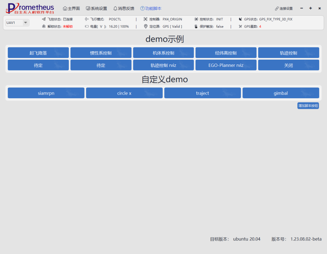 2、专业地面站软件PrometheusGroundStation-Pro是专用于Prometheus自主无人机系统(V2版本)的地面站软件,支持所有使用了Prometheus v2版本的无人机或者仿真主机。功能上包括了单机控制、集群控制、数据监控、视频流显示、卫星地图的轨迹显示和实时位置显示、平面地图的实时位置显示和期望点指示、参数配置、一键启动等功能。下面是部分功能界面展示:地图说明分为卫星地图和平面地图,其中卫星地图由无人机GPS数据进行实时位置显示。