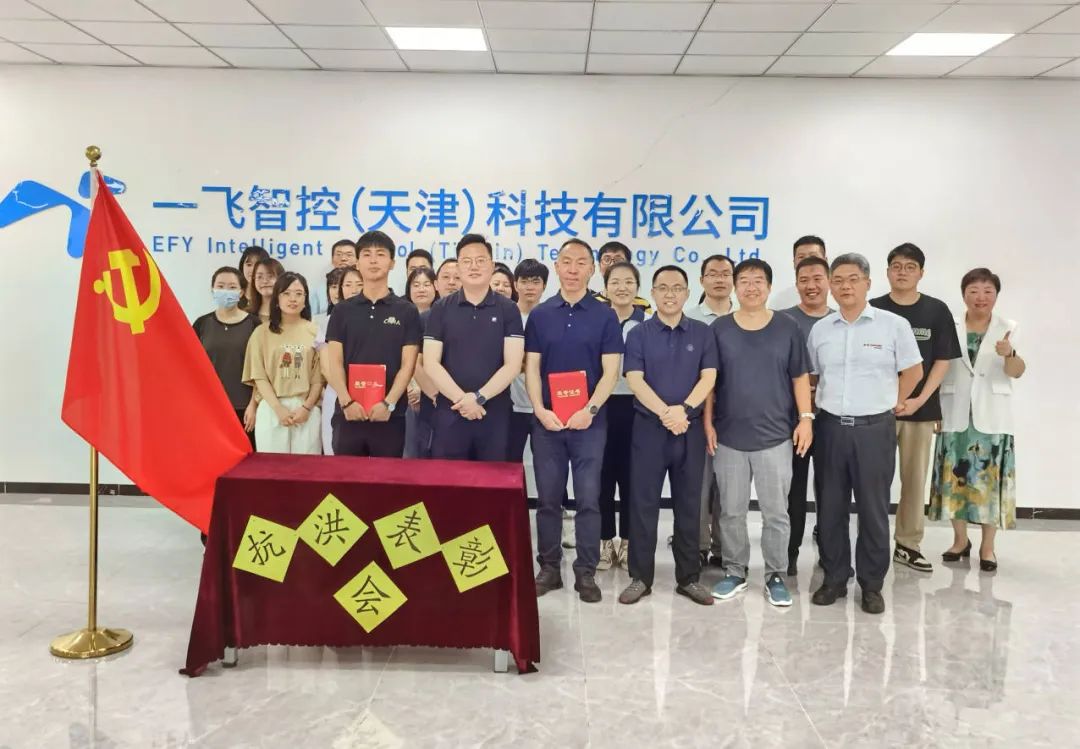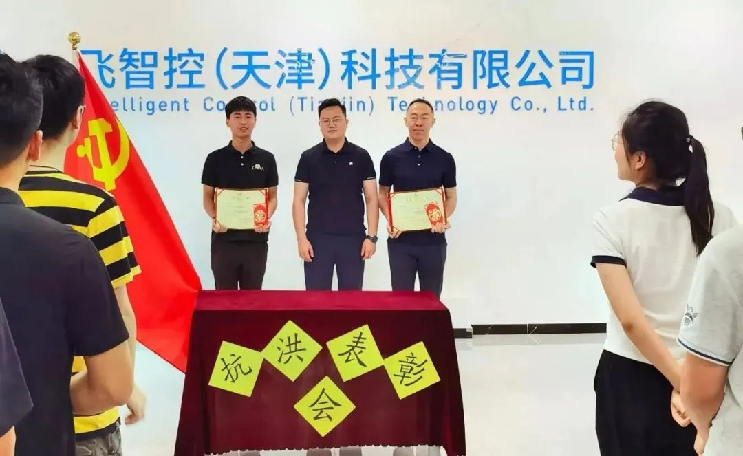 褚天翼,孙志明的事迹体现了一飞智控员工责任先行、心系家国的大爱,也向社会、行业展现了高素养的家国情怀和高品格的贡献精神,为公司全体员工做出了杰出榜样。8月31日上午,为表彰褚天翼、孙志明在此次抗洪救灾工作中的英勇事迹及运营团队如军人般不畏艰险,奋勇拼搏的精神和作风,一飞智控召开抗洪表彰大会。大会由管理中心总监高崧主持,公司总经理张云出席并为褚天翼、孙志明颁发“抗洪抢险勇士”荣誉证书并给予现金奖励,为运营团队颁发“一飞铁翼”番号并给予现金奖励。