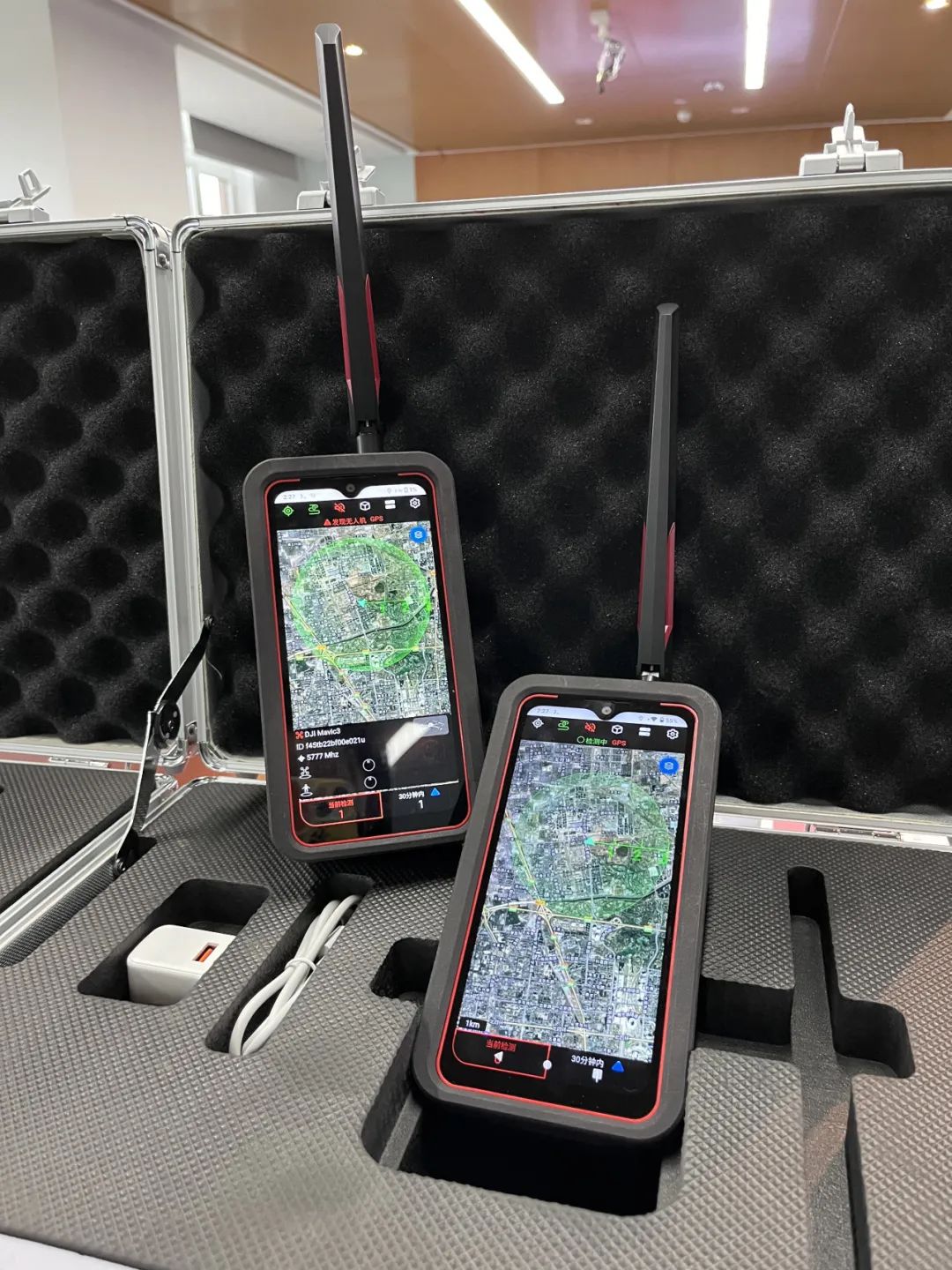 手提式无人机探测定位一体设备采用手提箱式一体设计,便于携行;基于先进的认知无线电协议破解技术(CRPC),实现无人机探测识别、预警定位、轨迹跟踪;当防御区域内有无人机时,设备可通过声光方式进行告警,同时通过CRPC+报文级协议解析,确定目标无人机、飞手(遥控器)的实时位置,并实时跟踪无人机飞行轨迹,适用于伴随式机动低空保障。