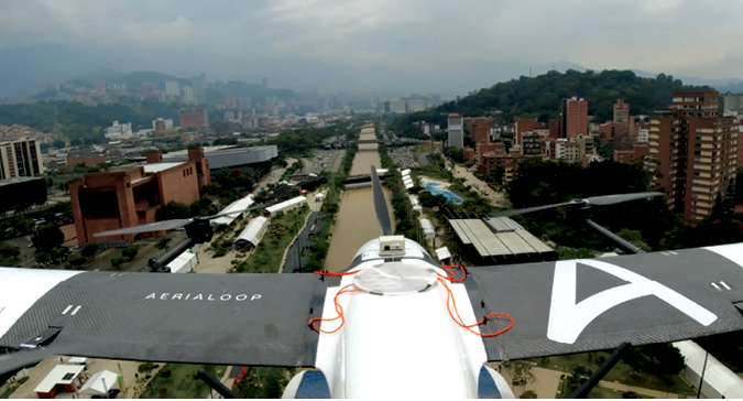 Aerialoop根据其最新许可证在哥伦比亚麦德林市中心的交通上空飞行一个环路或走廊。