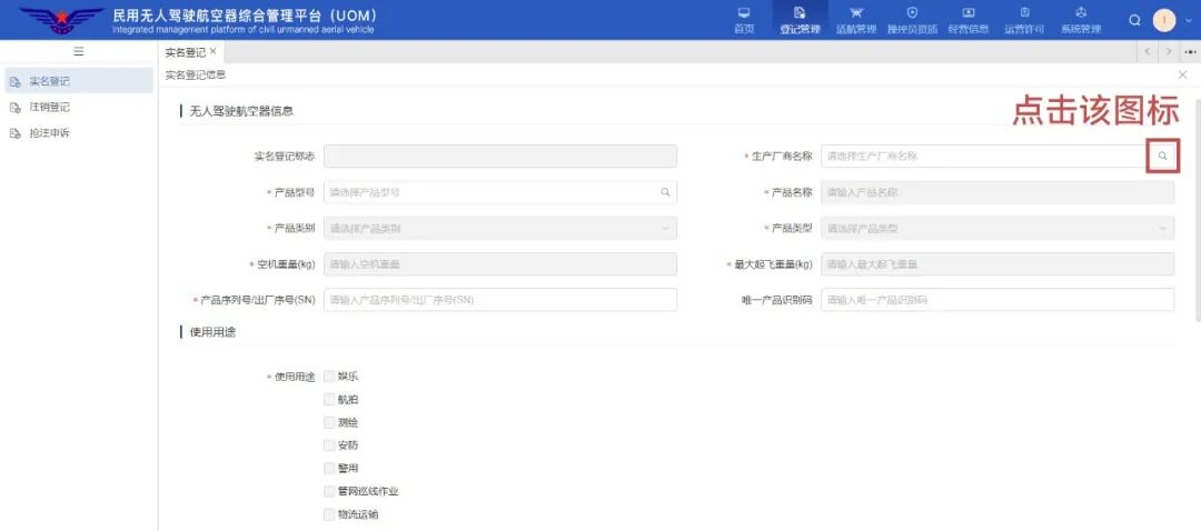 ▼完成人脸识别认证后,将在页面中显示您需要选择、输入、上传信息的表格,点击 [生产厂商名称] 右侧的搜索图标。
