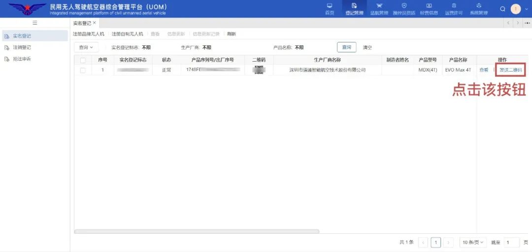 打印并粘贴二维码 完成注册后,可在实名登记页面中查询到已完成注册登记的无人机,点击右侧[发送二维码] 按钮。