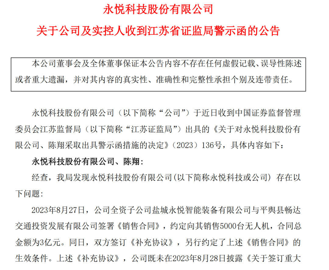 江苏证监局指出,对于《补充协议》,永悦科技既未在8月28日披露《关于签订重大合同的公告》的同时予以披露,也未在9月5日披露《关于媒体报道的澄清公告》时予以披露。公司上述信息披露不完整的情况;公司董事长陈翔未能勤勉履行职责,确保公司依法披露相关信息。两者均违反了《上市公司信息披露管理办法》的有关规定。