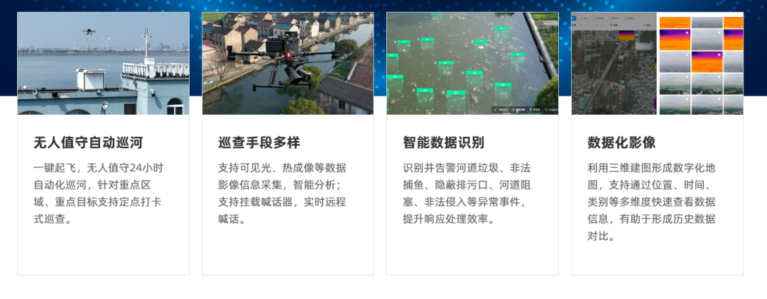 在巡视过程中,通过无人机高空视角对河道排污、漂浮垃圾、黑臭水体、城市防汛等场景进行智能识别,利用智能算法将无人机巡河数据进行实时分析和隐患精准定位,并实时将无人机巡河发现的隐患图像推送至河管员,构建了“无人机天上巡+河管员地下查”的立体监管体系。
