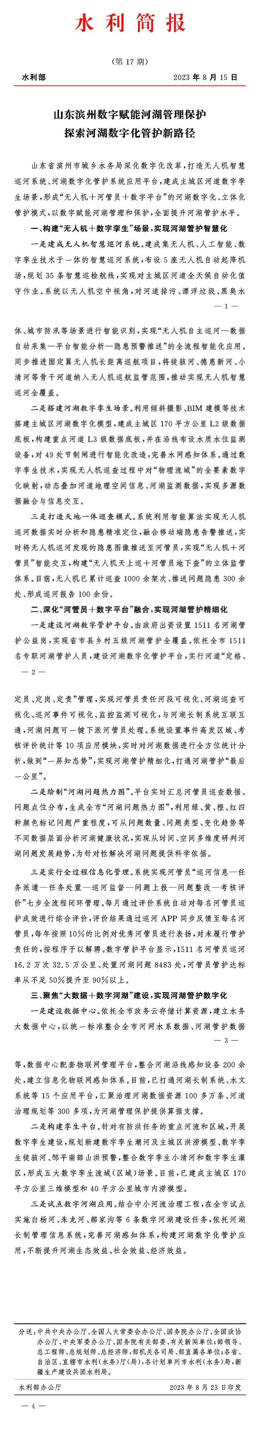 按照“需求牵引、强化整合、共建共用”原则,滨州市深化数字化改革,以数字赋能河湖管护,通过“无人机+河管员+数字平台”的河湖数字化、立体化管护模式,纵深推进河湖长制工作,统筹抓好水灾害、水环境、水生态、水污染,持续推进美丽幸福河湖建设,全力打造“河畅、水清、岸绿、景美、人和”的美丽幸福河湖“新画卷”,沿线群众的幸福感、获得感、满足感显著增强。