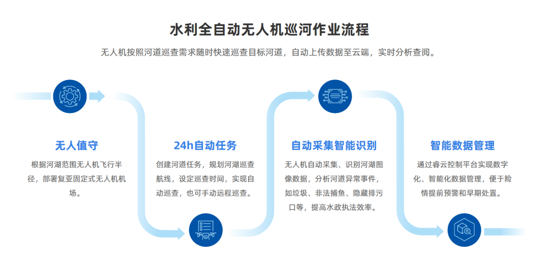 解决河涌数量众多,水网交错复杂带来的巡检时间长、投入大、效率低、隐蔽问题发现难,取证手段单一等巡视问题,结合河长制实施以来,河道巡检“发现问题”、“反馈问题”、“整改问题”和“复核问题”的日常工作流程,滨州建成无人机智慧巡河系统,布设5座复亚智能无人机自动起降机场,规划35条智慧巡检航线,实现对主城区河湖全天候自动化值守作业,高效采集河湖数据,搭建“三个+”管护模式的数据底座。