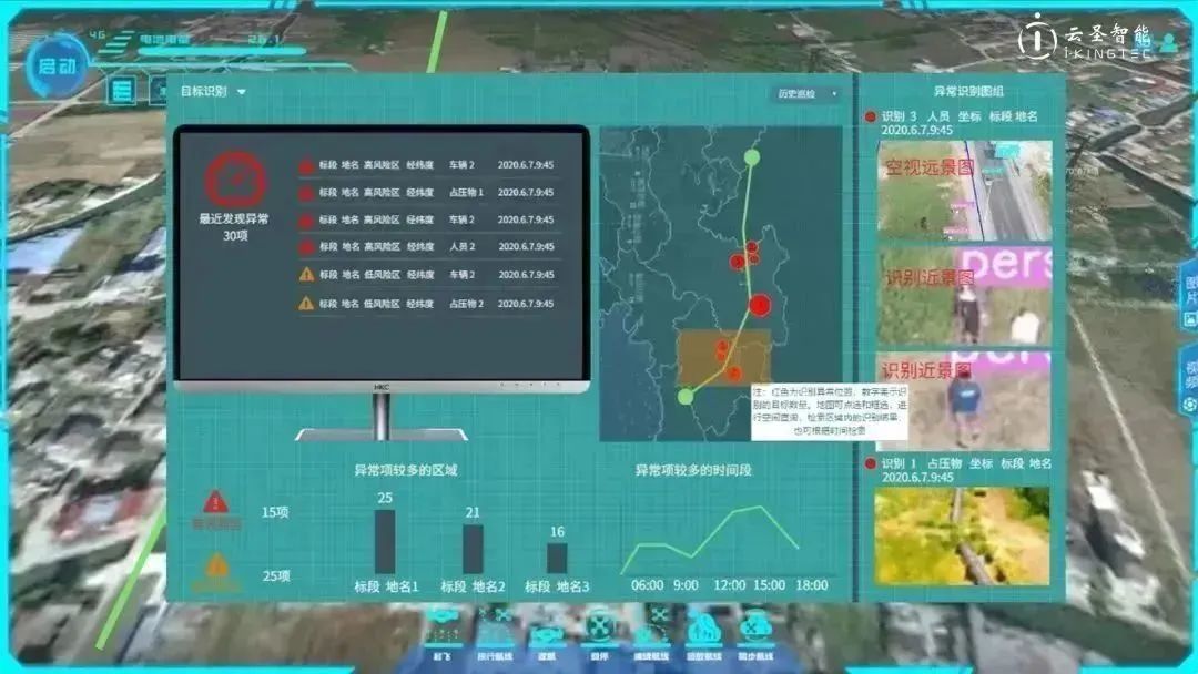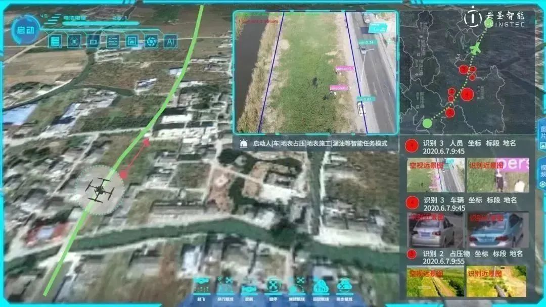 云圣智能基于“工业无人机+5G+人工智能+大数据+工业互联网”构建“机、网、云一体化”技术和产品生态,打造端边云协同计算的智慧中枢。端边云协同计算的反应速度更快,时延更低。如对异常现象场景(人、车、静物占压、施工、可见漏油等)实时识别及报警;对异常场景中目标信息(人脸、车牌号等)及时取证;对证据信息(图片、视频)的回传、分析以及基于大数据分析出具管道区域的风险分级报告等功能。