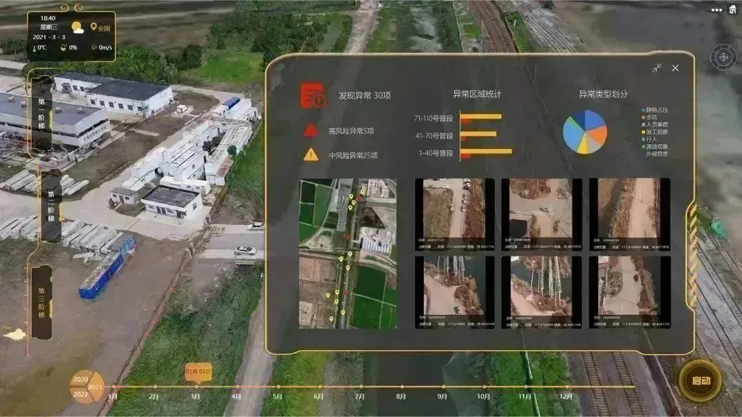 对于长输管道,四维全息管控平台可以操控百公里之外部署在长输管道沿线的全自动机场和无人机,实现上百公里,甚至上千公里的“蛙跳式”管网巡检,完全不受时空的限制,实现真正的足不出户,开启全线覆盖的巡检新模式。