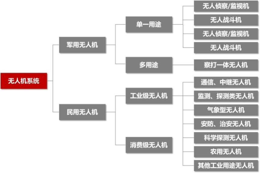 1)军用无人机按照作战用途可以分为单用途无人机和多用途无人机,单用途无人机按照任务又可以划分侦察机、战斗机、电子干扰机、通信中继无人机等,多用途无人机主要指察打一体无人机。