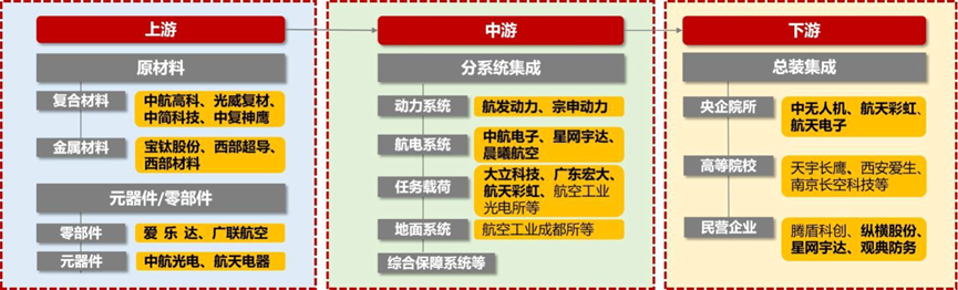 无人机产业链环节从原材料到总装集成,产业链完整性强。产业链上游主要由原材料、元器件、零部件供应商构成;中游为无人机分系统集成供应商,包括动力系统、航电系统、任务载荷、地面系统和综合保障系统等;下游主要为整机集成,央企院所、高等院校和民企共同参与。