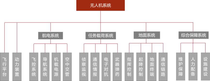 无人机系统包括飞行平台、动力装置、航电系统、任务载荷系统、航电系统、综合保障系统