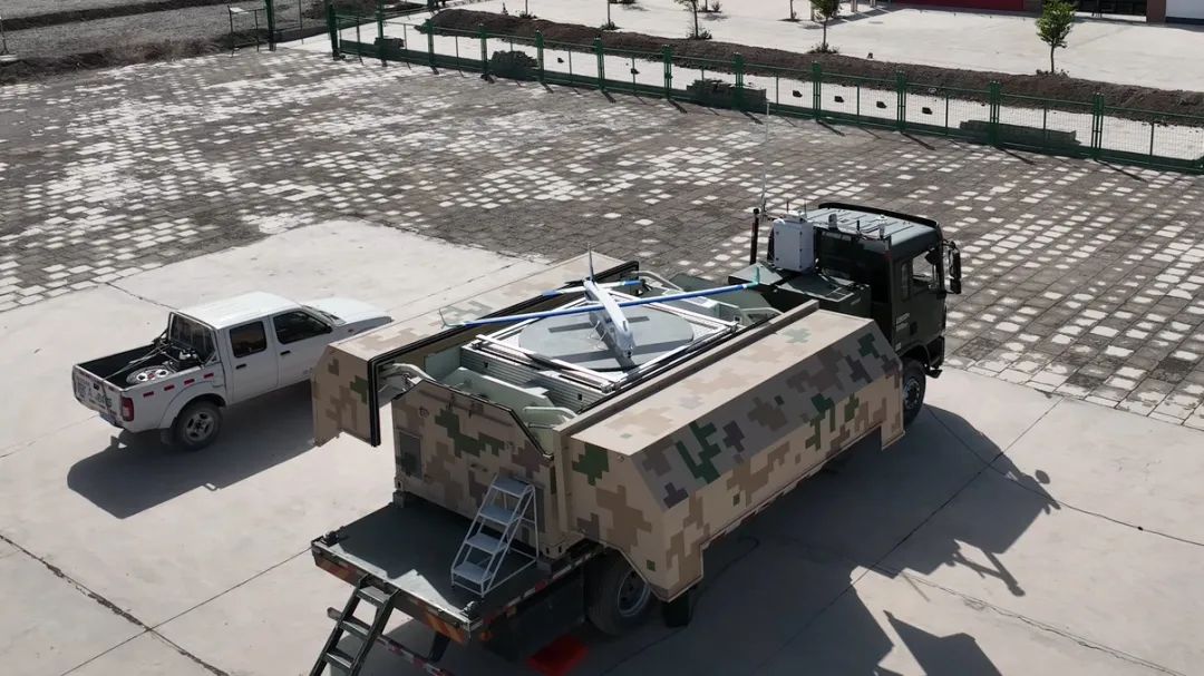 ▲自动机场旋转平台上准备起飞的“斥候”无人机