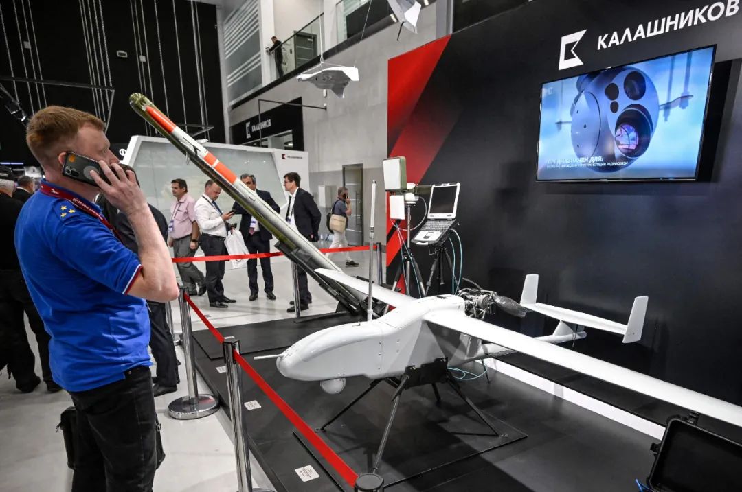 ▲8月15日,在莫斯科举行的国际军事展展出俄武器制造商卡拉什尼科夫集团公司制造的Granat 4E无人机。(法新社)