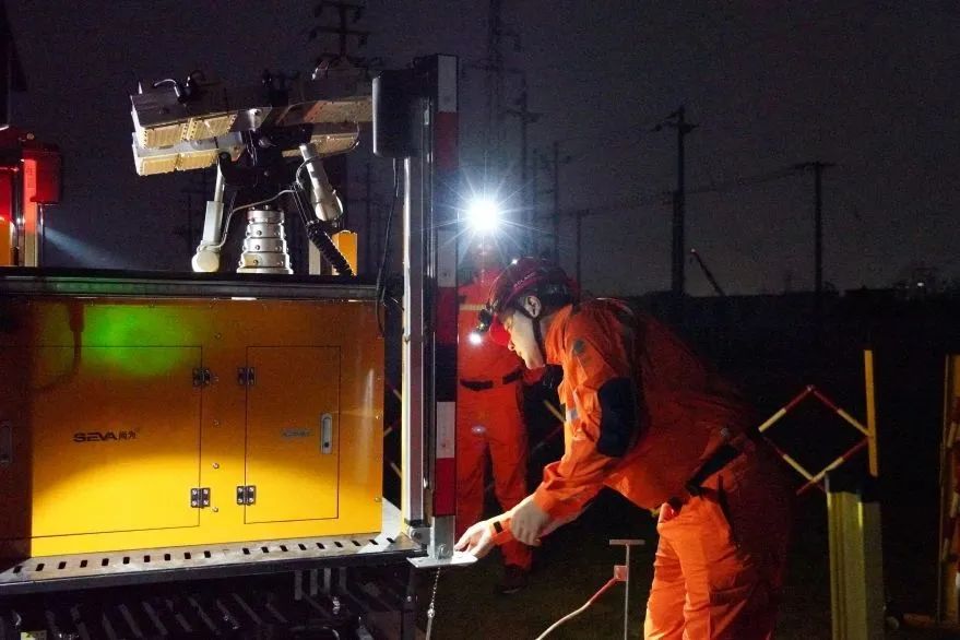 据现场工作人员介绍,系留无人机高空照明系统可一键起飞至指定高度位置悬停,通过系留线连接地面站主电源或发电机,实现4小时不间断续航,“居高临下”为作业人员提供充足照明,摆脱了地形及作业场地的限制,具有体积小、重量轻、机动性强的特点。该系统还可以根据不同作业场景选择挂载不同功率的照明系统,满足夜间紧急施工、应急抢修、抢险救灾等照明需要。