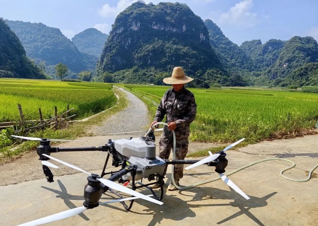 眼下正值晚稻种植管护的关键期,笔者在大新县龙门乡武安村龙益屯水稻基地看到,工作人员在给群众开展秋粮“一喷多促”技术指导,操作员在完成了药物配比后,在“机手”的操作下,在一片绿油油的稻田上辗转腾挪作业。相比传统的人工打药模式,农业无人机喷洒农药具有速度快、效率高的优点,不仅大大降低了人力成本,还提高了农药利用率。