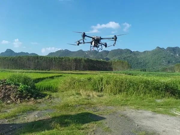 “嗡嗡嗡……”,一阵阵旋翼转动声,10月3日,早晨七点多在大新县龙门乡武安村龙益屯的水稻田上,一架农业无人机在“飞手”的操作下,在水稻田上空来回穿梭,旋翼下气流推动农药均匀散开,精准喷洒在水稻叶面上,短短十几分钟,便完成了近20亩的喷洒作业。