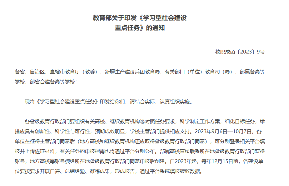 《通知》指出,要把建设学习型社会、学习型大国作为建设教育强国的战略举措,把教育数字化作为推进学习型社会建设的“倍增器”,聚焦关键单元和重点群体,点线面结合、近中远统筹,推动各种教育类型、资源、要素多元结合,调动社会上一切可利用的学习资源,打通家庭教育、学校教育、社会教育各环节,完善政府统筹、教育牵头、部门协同、社会参与的全民终身学习推进机制,构建网络化、数字化、个性化、终身化的教育体系,为教育强国建设提供有力支撑。