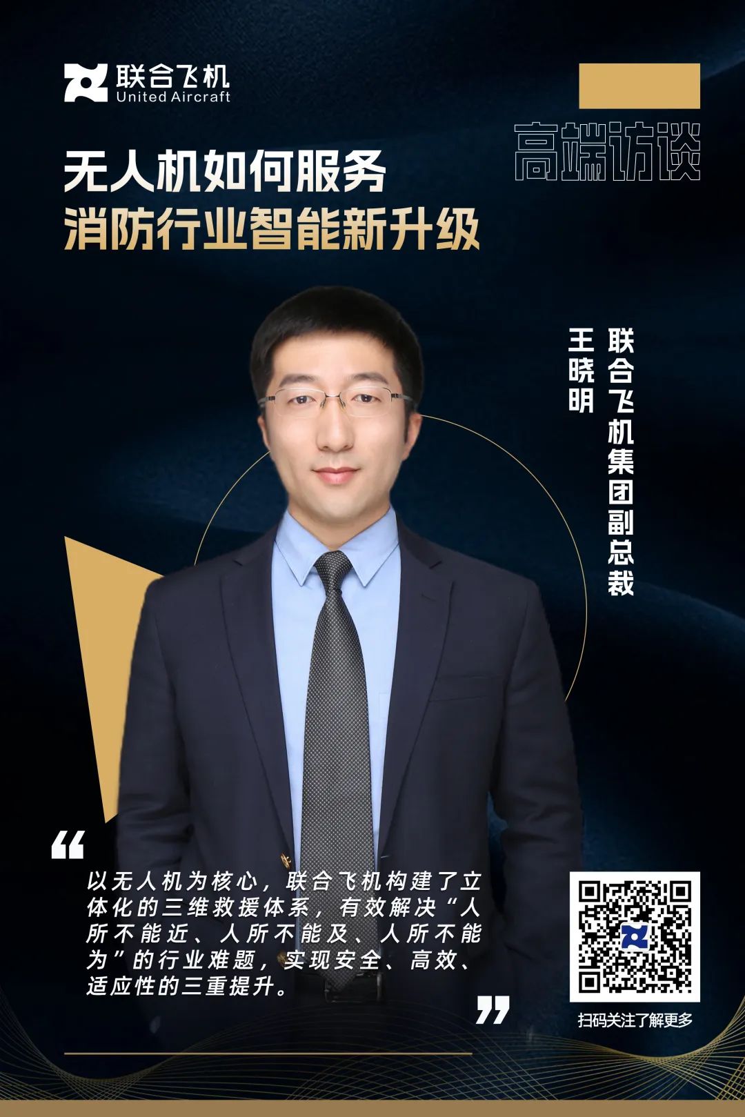 在“无人机如何服务消防行业智能新升级”高端对话环节中,联合飞机集团副总裁 王晓明谈到“以无人机为核心,联合飞机构建了立体化的三维救援体系,有效解决“人所不能近,人所不能及,人所不能为”的行业难题,实现安全、高效、适应性的三重提升”。