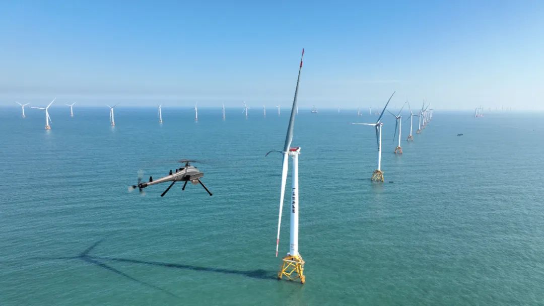 海上风机若采用传统的巡检方式面临成本与安全双重挑战,而无人直升机能较好地适应海上作业环境,覆盖大片海域开展风机叶片巡检、船只驱离、物资运输等工作,为海上风电运维带来全新解决方案。尤其在叶片检测方面,无人直升机搭载高倍变焦及高像素可见光相机和红外热成像相机,可进行更高效的停机/不停机叶片检测。阳江某海上风电项目采用紫燕无人直升机,针对阳江海上风电机群47个风机与升压站开展全景拍摄,按照风机坐标系完成正摄影数据采集,为风电场的安全运行保驾护航。