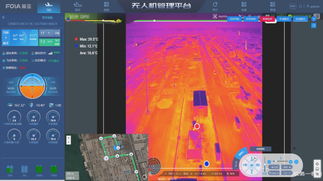 部署全自动化无人机巡检系统后,港区已形成自动化、智能化立体巡视体系。无人机按照预约任务自主作业,在港口应用场景中对岸桥、轨道吊、装卸船机等多种港口设备和箱区管理、货物码放、车辆组织等情况进行数据采集,现场状况实时显示在睿云管控平台上,协助发现有重大安全隐患、人员违规操作、危化物品泄露、无关船舶和车辆进入等事件,并在巡视结束后自动生成巡视报告,自动飞行系统全面覆盖人工检测盲区,全方位记录港区动态状况,全面可视化监控,搭载红外摄像头还可实现全天候值守,时刻守护港区平安。