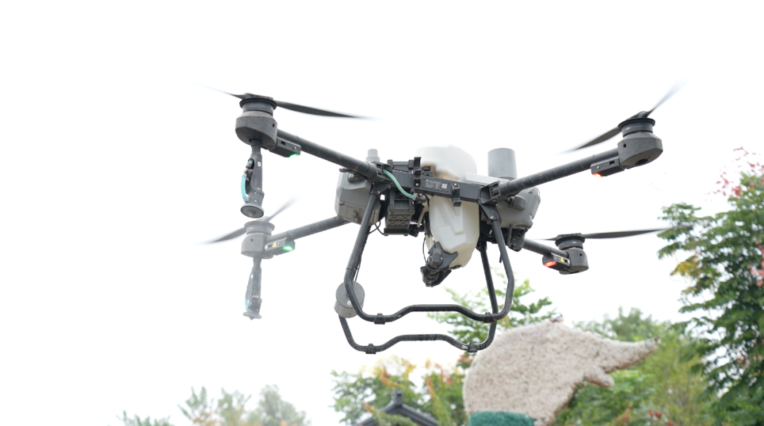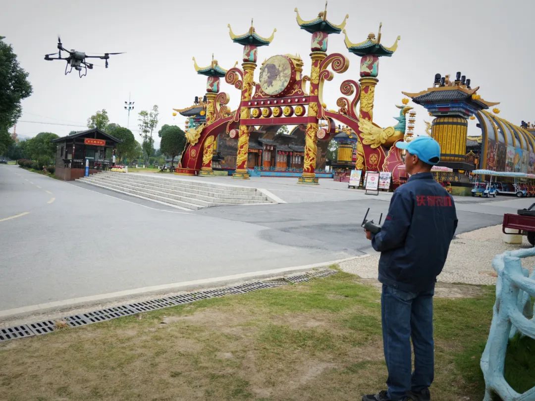 10月19日清早,记者在木兰花乡景区的木兰不夜城看到,一架硕大的四轴无人机正在进行灭蚊消杀。操作员把20升的药筒装在机身正中,4个喷口接到起落架四角。随着操作员遥控,无人机腾空而起,在演出广场、水池、草坪等地开始喷洒白色的药雾。“景区消杀面积一百多亩,通常要飞6个航次,草坪、广场等重点区域还要反复喷洒。”操作员老李说。
