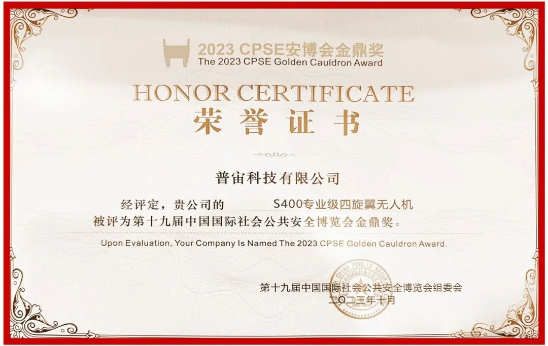 10月24日,第十九届中国国际社会公共安全博览会(CPSE安博会)“金鼎奖”颁奖盛典在深圳举行。经过专业评审团队对产品的品质、性能、市场表现、应用价值等多方面综合评估,普宙科技旗下S400专业级四旋翼无人机获得“金鼎奖”。