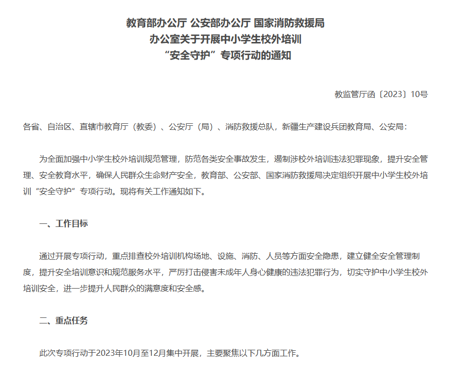 为全面加强中小学生校外培训规范管理,防范各类事故发生,保障学生人身安全,近日教育部、公安部、国家消防救援局联合部署开展全国校外培训“安全守护”专项行动。