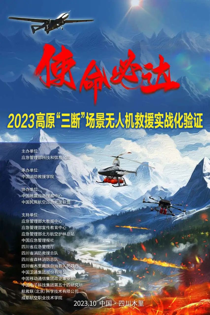 2023高原“三断”场景无人机救援实战化验证由应急管理部科技和信息化司主办,中国消防救援学院无人机应急救援技术重点实验室承办,中国地震应急搜救中心、中国民用航空应急救援联盟协办。