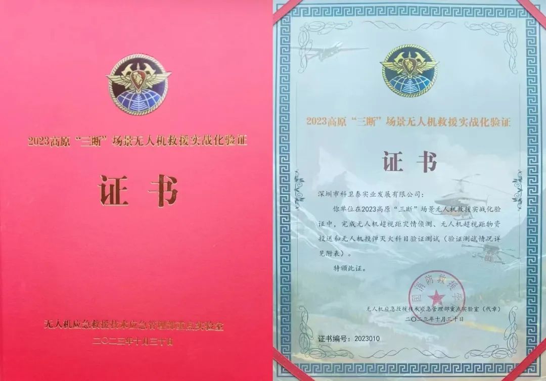 科卫泰共申报了“非视距侦察”、“非视距物资运投”和“无人机投弹灭火”3个验证科目,我们均按要求一次性完成任务。科卫泰无人机的可靠性、系统成熟性和卓越的性能参数如续航能力和载重能力等受到专家的好评并获得了三个科目的“完成实战验证”证书。