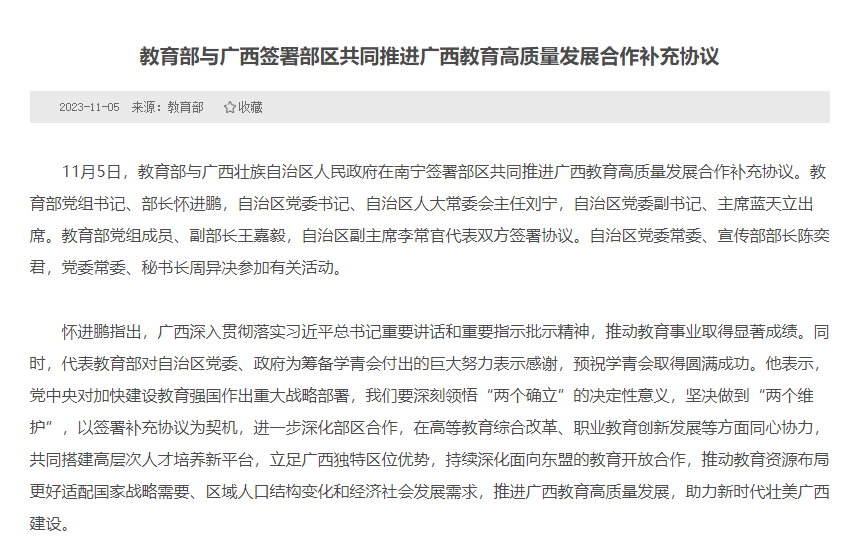 教育部与广西签署部区共同推进广西教育高质量发展合作补充协议