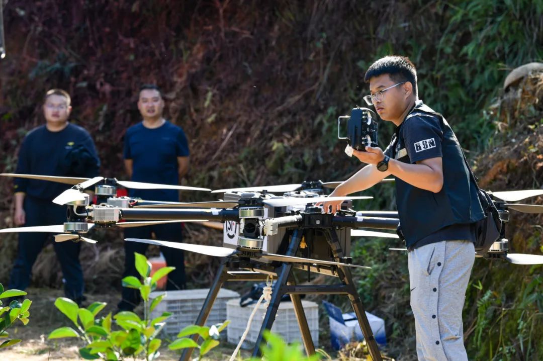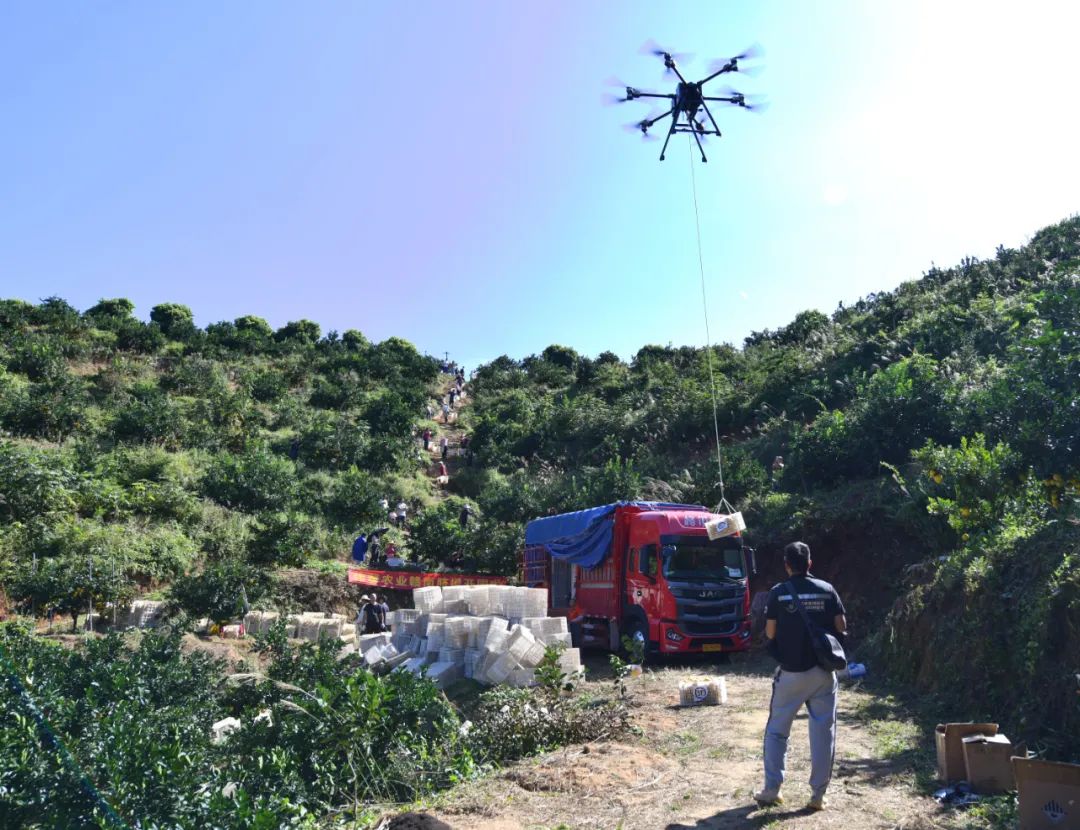11月6日,在定南县鹅公镇大风村脐橙基地,定南伟馨农业发展有限公司联合顺丰速运有限公司无人机快递公司,将刚采摘的赣南脐橙转运至山下上车。长期以来,从山上到果园产业路之间,脐橙的转运主要靠人力,转运效率低、成本高。2023年,定南引进相关企业,组织技术培训,探索使用无人机转运脐橙、化肥,开展植保等,以减少人力成本,提高转运效率。
