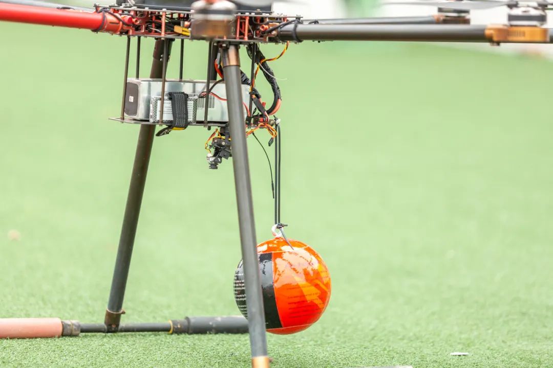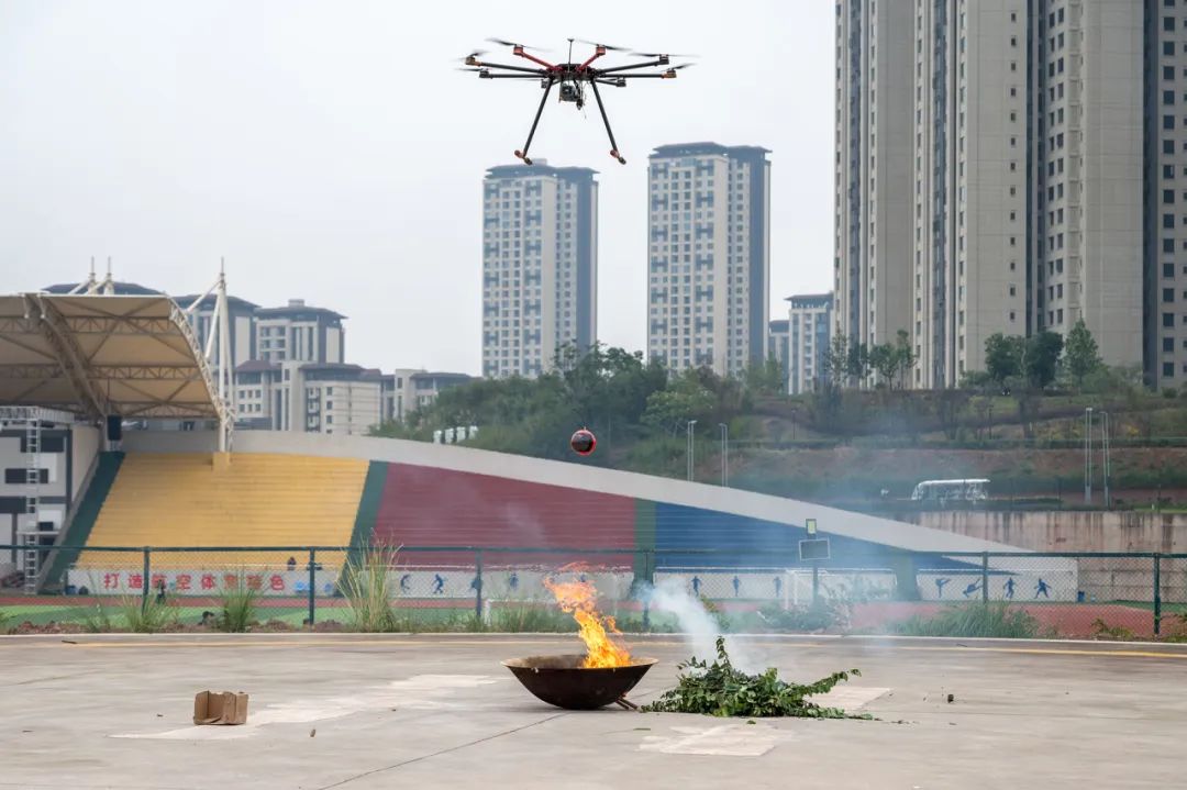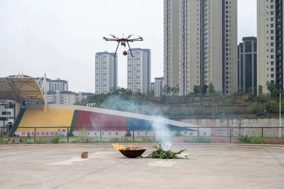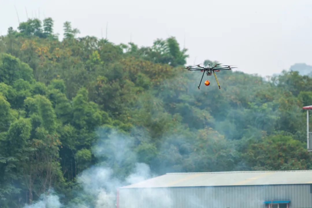 一切准备就绪,无人机降低飞行高度,确保经燃烧爆破后的“干粉”全覆盖起火点后,释放灭火弹,达到“一击必中”“一击必灭”目标效果。